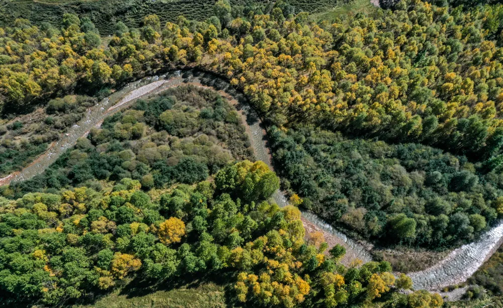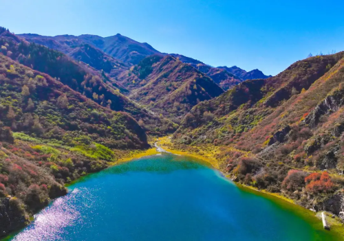 再赏那水。那穿行于峡谷沟涧的清流,澄澈透亮,宛如一块会流动的温润翡翠。它绕着金黄的山脚,曲曲折折,像一条柔软的、闪着光的丝带,将那斑斓的林带轻轻挽住。水色是泠泠的碧,水声是淙淙的琴音,漾起的细碎涟漪,将岸上秋林的倒影揉碎又拼合,光与影在此共舞一曲静谧的圆舞。正是“秋水清无底,萧然静客心”,山因水而灵秀,水因山而风骨宛然。