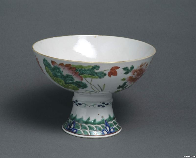 大家好,今天向大家分享的是清代瓷器——粉彩高足瓷碗。敞口,弧腹,高足呈竹节喇叭状。腹部饰梅、菊、牡丹、荷花。下饰缠枝花卉、水波纹、礁石纹。碗内底心饰蕉叶纹、寿桃。为国家三级文物,现馆藏于武威市博物馆。