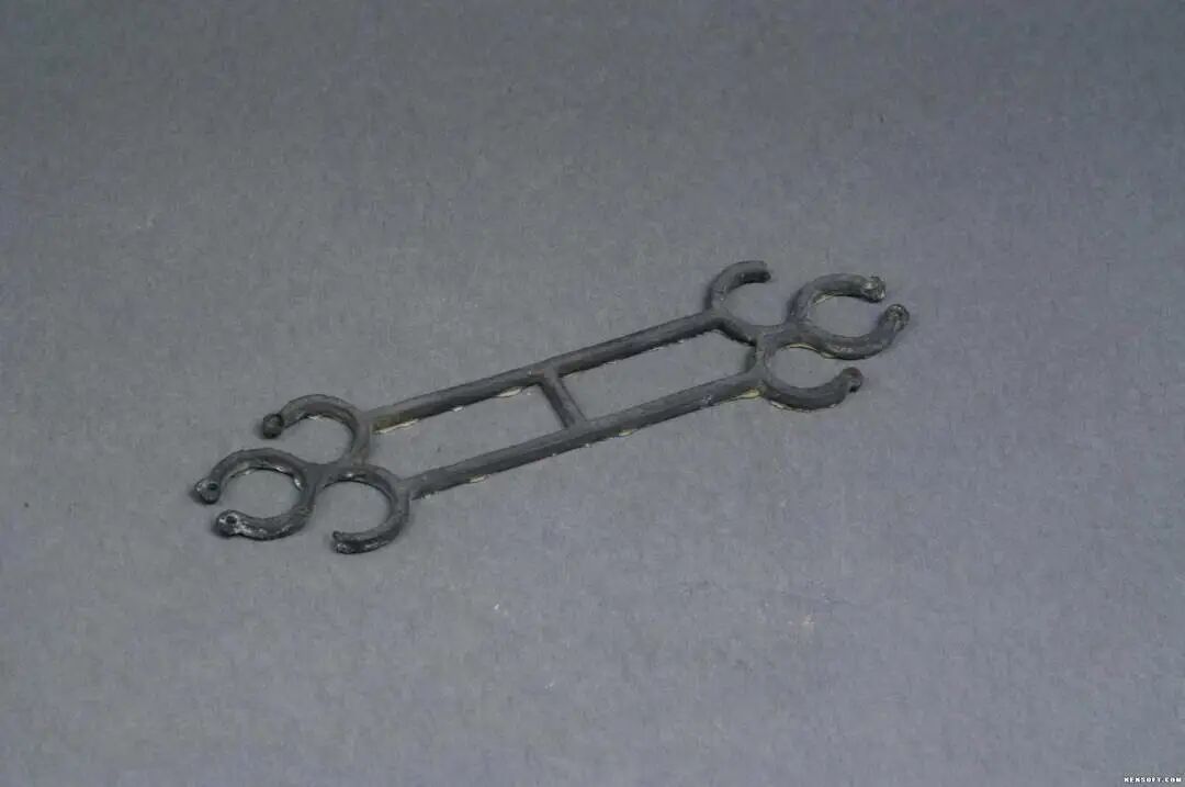今天为大家分享铜佩饰。魏晋时期,青铜质。长条形,两端各有三个半圆组成的对称圆形,圆弧末端有小孔,中有一横衬,当为佩饰件。为国家三级文物。现藏武威市博物馆。