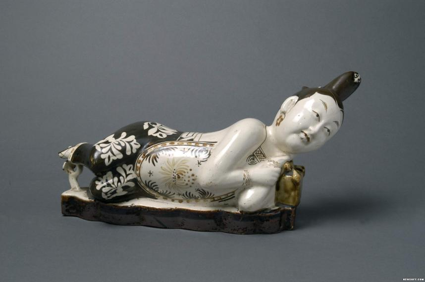 大家好,今天向大家分享的是清代瓷器——褐彩卧美人瓷枕。卧姿,元宝发髻,面部丰腴,体态丰满。佩耳环、手镯、身着肚兜、长裤。发髻、面貌、衣褶线条、纹饰及佩饰均褐彩。肚兜与长裤上绘饰团花。身下为一长条形床,床边沿为弧形,褐彩,釉色细腻。甘肃省武威市城关镇出土,为国家三级文物,现馆藏于武威市博物馆。