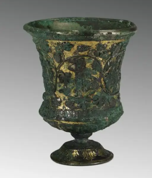 ▲北魏铜鎏金童子葡萄纹高足杯