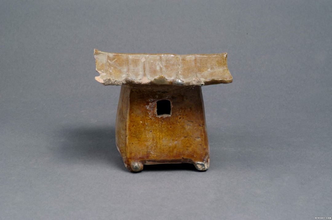 今天为大家介绍的是汉代陶器,黄釉陶仓。出土于甘肃武威中坝乡高楼村,红陶质,施黄釉,起脊,仓身呈四棱柱体,正面开一方形仓门,四足。为国家三级文物,现馆藏于武威市博物馆。
