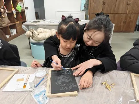 活动现场,讲解员以馆藏有鎏金工艺的文物为切入点,将凉州会盟的历史画卷徐徐展开,从民族交往的历史脉络,到鎏金工艺在多民族文化交融中的演变,在一件件文物中,讲解员生动讲述了公元1247年阔端与萨班“以和谈代征战”的历史佳话,阐释了凉州会盟如何为西藏正式纳入中央政府行政管辖奠定基础,让青少年深刻理解“一张谈判桌胜过千军万马”的和平智慧与“同心铸国魂”的深厚内涵。随后的金箔制作环节,讲解员手把手教学,从金箔的挑选、裁剪,到图案设计、粘贴装裱,每一步都细致指导,青少年们发挥创意,将一张张薄如蝉翼的金箔,转化为承载历史记忆、弘扬民族精神的艺术品。 活动现场孩子们专注创作,家长们在旁协助,亲子协作的温馨场景随处可见。此次活动不仅让青少年深入了解了家乡的历史,更真切感受到各民族同心筑梦的力量。