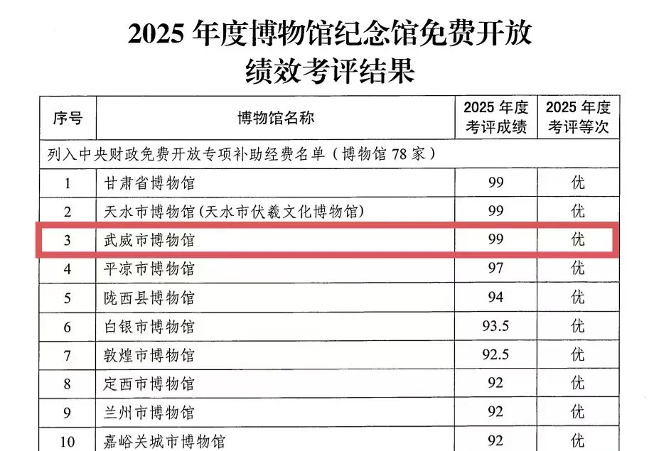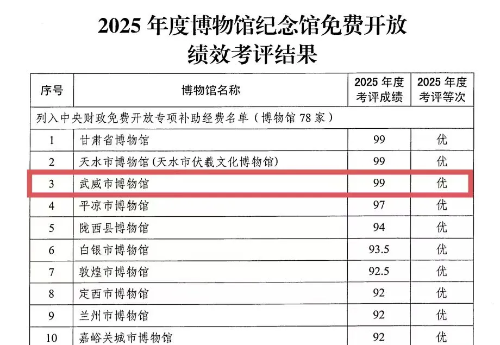 坚持围绕中心抓党建、抓好党建促业务,深化“当好守护人,让文物‘活’起来”党建品牌升级,推动党建工作与市博物馆高质量发展深度融合、同向发力。扎实开展“我为群众办实事”提质行动,优化观众服务流程,累计接待观众112万人次,提供义务讲解1100次,开展“四进”、社教等主题活动114场,举办各类临时展览23个,文化服务覆盖面和满意度持续提升。2025年,市博物馆成功举办“甘肃省中小博物馆陈列专业综合培训班”,被省市场监管局、省文物局评为“甘肃省文物和文化衍生产品知识产权保护试点单位”,并成为“一带一路”文化遗产国际合作联盟理事单位;“共情 共鸣——武威市博物馆藏民族文献展”获2025年全省博物馆陈列展览优胜奖,“妙像丹青——武威水陆画艺术展”获2025年度甘肃省“博物馆里读中国——文物里的甘肃故事”主题展览推介项目,在全省博物馆纪念馆免费开放绩效考核中,市博物馆得分99分,并列全省第一名,连续五年被评为“优”等次。