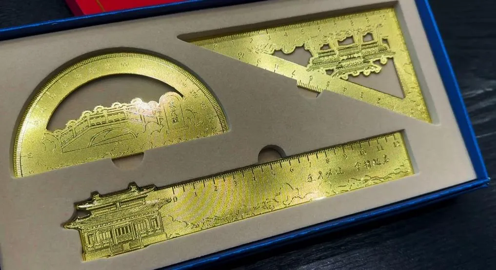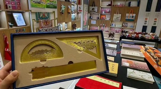 - 三角尺里嵌着棂星门——文庙棂星门的飞檐翘角直接“焊”在尺头,连斗拱纹路都雕得清清楚楚,拿在手里像把缩小版的古建筑;