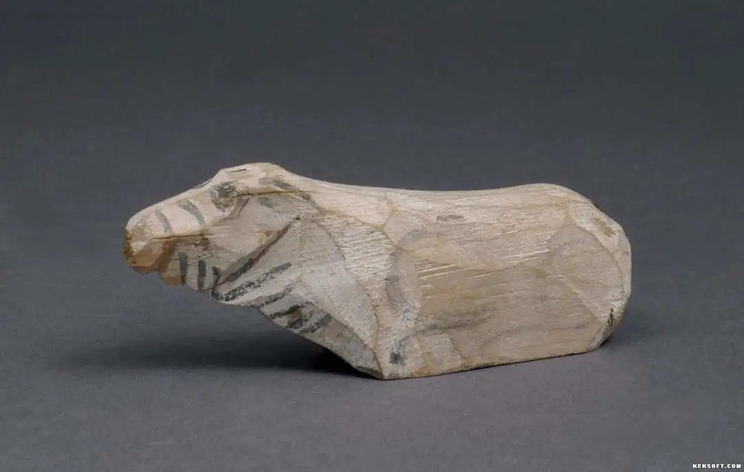 今天为大家分享的是汉代漆木器彩绘木雕卧羊,甘肃武威新华乡磨嘴子出土,通长13.5厘米,高5厘米,整木削制,卧姿,昂首,长嘴细颈,尾短而尖,通身白底,黑彩绘鼻、眼等部位,手法简练,具有鲜明的时代和地方特色,具有较高的历史、艺术价值。为国家二级文物,现馆藏于武威市博物馆。
