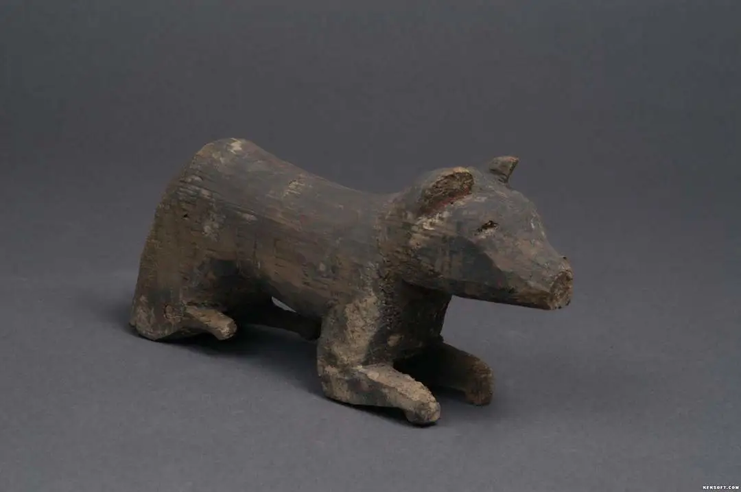今天向大家分享墨绘木狗,汉代漆木器,松木质,通长23厘米,通高10.5厘米,胸宽5厘米。卧姿,抬头竖耳,眼睛生动传神,臀微抬起,作前冲警觉状。尾缺,身涂黑色,红色勾勒。出土于武威韩佐乡五坝山。为国家二级文物,现馆藏于武威市博物馆。