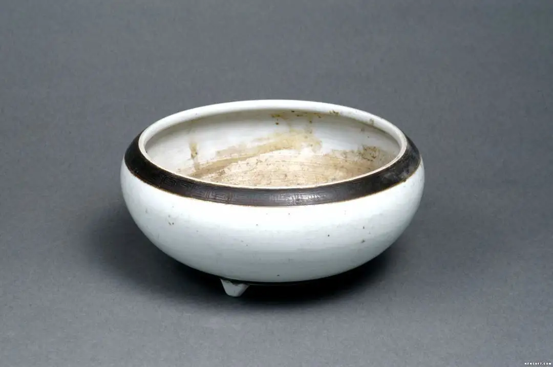 大家好,今天为大家分享的是白瓷盂,清代瓷器,1989年9月甘肃省武威市民勤县蔡旗乡征集。该器皿敛口,鼓腹,浅圈足,三足。白胎白釉。内壁自腹至底密布旋纹,无釉。外口沿,下腹壁,器底三圈施黑褐色釉,并施云雷纹。为国家三级文物,现馆藏于武威市博物馆。