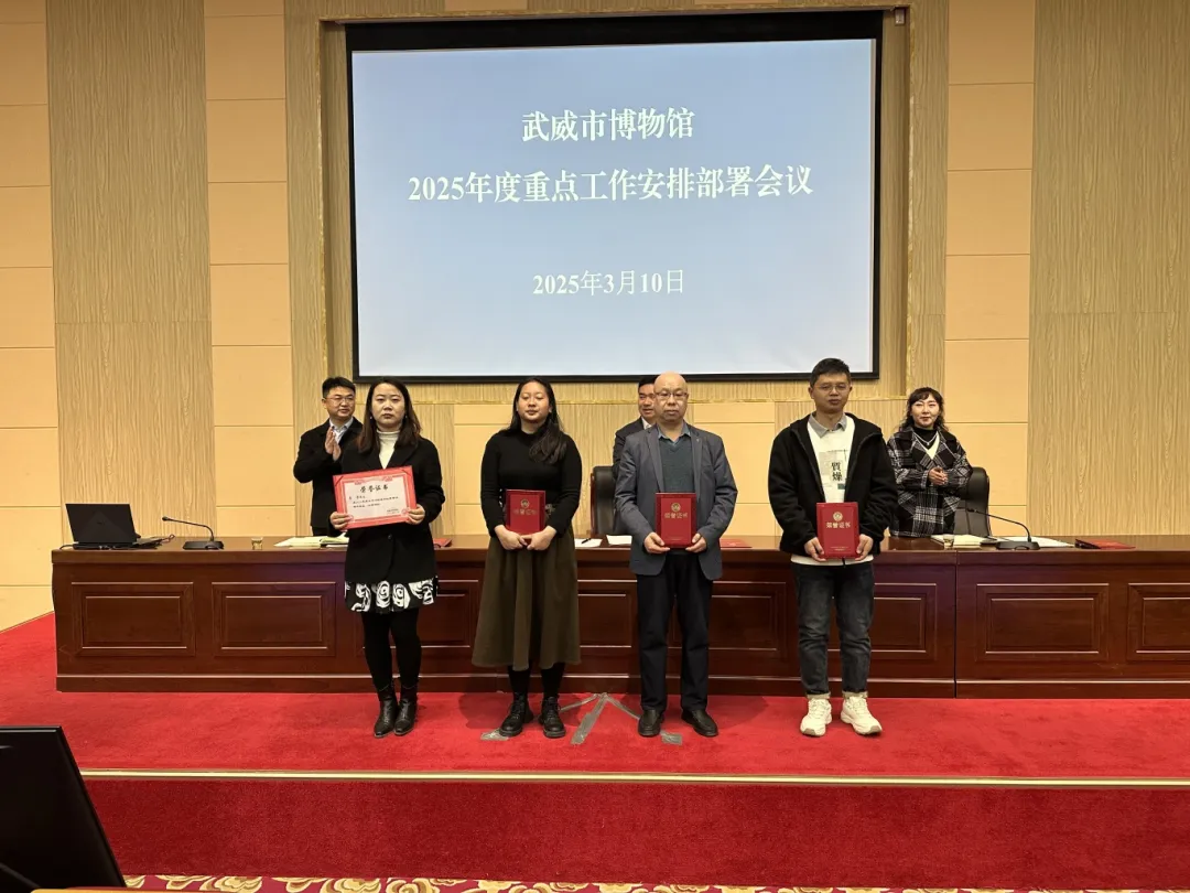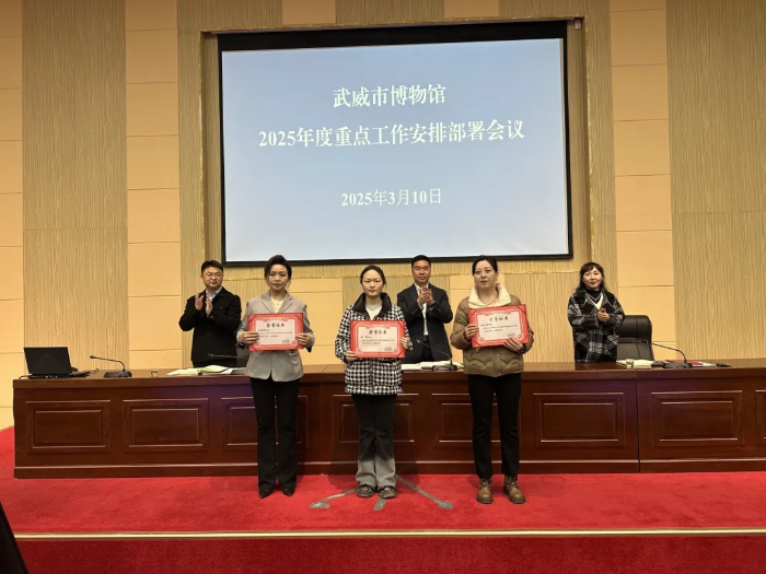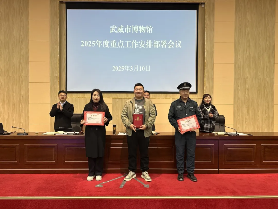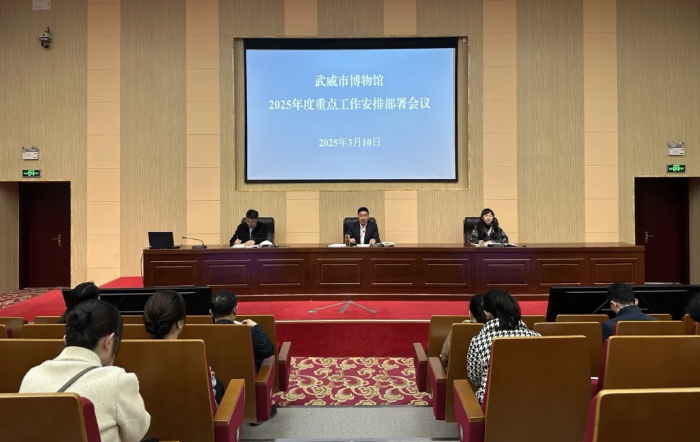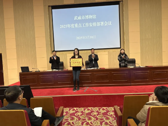 会议强调,2025年是贯彻落实习近平总书记视察甘肃重要讲话重要指示精神的重要一年,是“十四五”规划的收官之年。市博物馆将紧紧围绕中心工作任务,严格对照一级博物馆运行评估标准,创品牌、争一流,精准用力,抓实重点工作。一要强化政治引领,着力提升党建工作水平。坚持以严的标准推进全面从严治党,提升党组织建设质量,认真执行“三会一课”等制度,不断深化“当好守护人,让文物‘活’起来”党建品牌,对照党支部建设标准化目标要求,开展系列主题活动和志愿服务活动,进一步增强支部战斗堡垒作用。二要持续发力,着力提升作风建设成效。要走稳步,强化攻坚意识,理清各项工作的重点和难点,一步一个脚印,以扎实过程换取实在成果;要迈大步,树立进取信念,谋划大思路、采取大举措,争先进位,打造拿得出手的工作成绩;要早一步,提前谋划,对必须做的、规律性的、有苗头的事抢先一步,赢得主动;要高半步,提升站位,拓宽视野,做到人无我有、人有我优。三要强化固本培元,着力提升综合管理质效。不断完善各项安全管理制度,加大对全馆干部职工培训力度和深度,尤其是加强对一线工作人员的专业知识和实操培训,确保参观安全万无一失、馆藏文物绝对安全。四要多措并举,着力优化提升服务质量。不断完善多媒体展示设备,探索打造中庭院“元宇宙”沉浸式体验场景,让文物“动”起来。树立“观众至上、微笑服务”观念,及时开展观众满意度调查,摸清观众对展览、服务等方面作出的总体评价,有的放矢地提高服务品质。同时,探索博物馆更多“打开方式”,进一步满足观众的多元化参观需求。五要强化馆藏利用,着力提升文物保护研究。积极争取中央、省级相关资金支持,持续做好馆藏陶瓷器、馆藏青铜器等项目的保护修复工作。发挥学术小组带动作用,加强与中国博物馆协会等文博院所、科研机构的交流合作,并通过参与文物修复、展览策划等项目课题,不断提高科研水平。六要强化主责主业,着力丰富公众文化供给。坚持“引进来、长见识,走出去、扩宣传”的工作思路方针,创新展陈方式,进一步提升原创展览策展水平;持续优化“文博社团” 等社教品牌,推出“菜单式”服务,公共文化服务可“圈”又可“点”;探索“博物馆 +”模式,在开发“武博动物园”系列毛绒玩具等传统文创产品的同时,利用3D打印、AR、VR等技术开发武博特色数字化产品,赋能市博物馆高质量发展。
