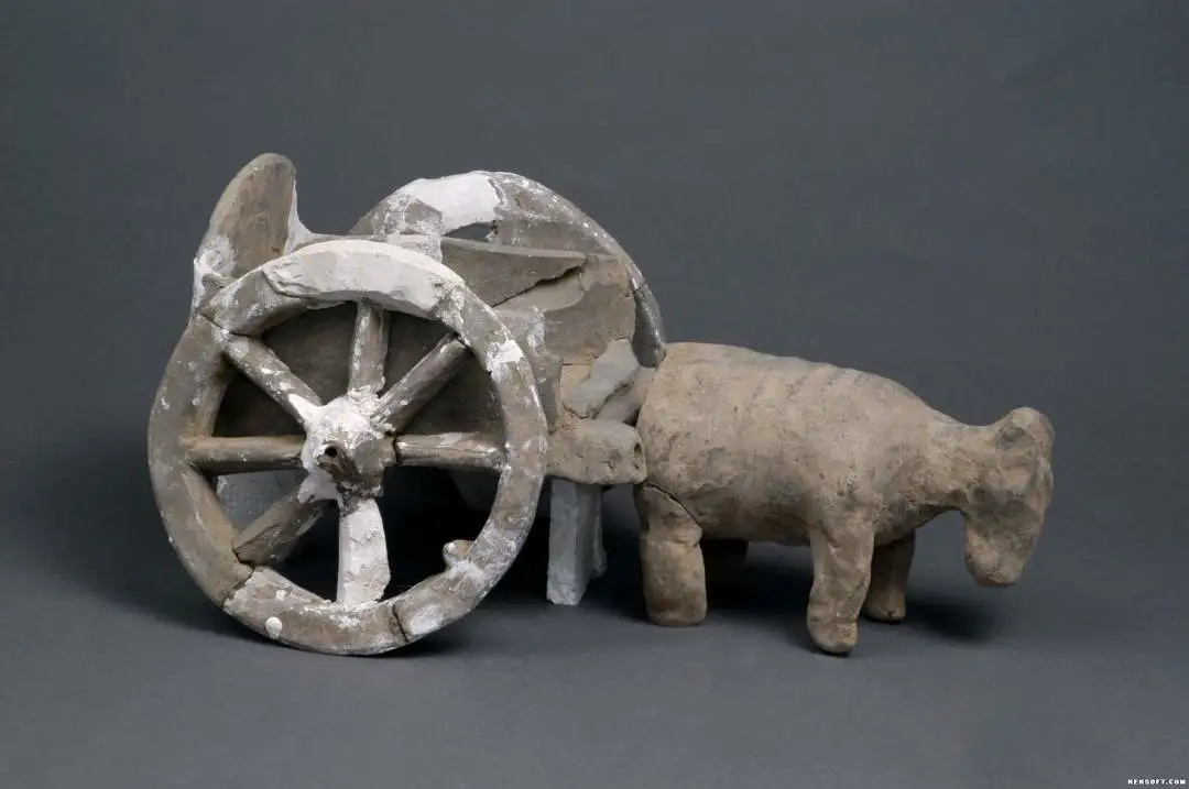 大家好,今天为大家分享的是魏晋时期陶器灰陶牛车。灰陶质,分牛、车两部分。牛立姿,低头垂尾,制作粗糙。车厢长方形,无前栏,左右栏低,后栏高,呈半圆形。有檐条作插孔。两轮,有轮轴插孔。车厢底座上两侧各有两孔,为绑缚车轮用。为国家二级文物,现馆藏于武威市博物馆。