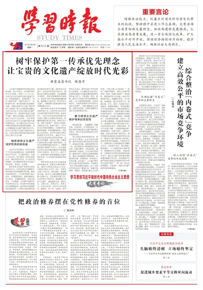 文化遗产承载着中华民族的基因和血脉,是不可再生、不可替代的优秀文明资源。党的十八大以来,习近平总书记对保护传承文化遗产作出一系列重要指示,系统回答了“为什么保护传承”“保护传承什么”“怎样保护传承”等方向性根本性战略性问题,为做好新时代文化遗产保护传承工作提供了努力方向和根本遵循。习近平总书记十分关心甘肃文化遗产保护传承工作,要求我们加强文化遗产保护,推动文化创新。我们要自觉践行习近平文化思想,全面贯彻习近平总书记关于文化遗产保护传承的重要论述,深入落实习近平总书记考察甘肃重要讲话重要指示精神,用心用情推进文化遗产保护传承工作,努力让宝贵的文化遗产绽放时代光彩,为奋力谱写中国式现代化甘肃篇章注入强大文化力量。习近平总书记指出,历史文化遗产不仅生动述说着过去,也深刻影响着当下和未来;不仅属于我们,也属于子孙后代。我们要进一步深化思想认识,秉持对历史负责、对人民负责的精神,切实增强保护传承文化遗产的自觉性、坚定性、主动性。保护传承文化遗产是现代化建设的应有之义。中国式现代化是物质文明和精神文明相协调的现代化。推进中国式现代化,不仅要在物质上强大起来、实现物质富裕,也要在精神上强大起来、实现精神富足,两者互相依存、不可偏废。文化遗产承载的中华优秀传统文化,积淀着中华民族最深沉的精神追求,蕴含着中华民族独特的精神标识,为现代化建设提供着深厚滋养和动力支撑。保护传承文化遗产,是弘扬中华优秀传统文化、赓续历史文脉的必然要求,是加强精神文明建设、维系民族精神的内涵要义。要站在守护中华民族根和魂的高度,像爱惜自己的生命一样守护好文化遗产,为推进现代化建设提供价值引领和强大动力。保护传承文化遗产是牢记领袖嘱托的现实之为。习近平总书记对甘肃文化遗产保护传承寄予厚望。2016年9月,习近平总书记向首届丝绸之路(敦煌)国际文化博览会致贺信,明确提出要加强文化交流,倡导文化平等,保护文化遗产,推动文化创新,加强文化合作。2019年8月,习近平总书记考察甘肃期间,在敦煌研究院座谈时指出,把莫高窟保护好,把敦煌文化传承好,是中华民族为世界文明进步应负的责任。2024年9月,习近平总书记再次亲临甘肃考察,走进天水伏羲庙、麦积山石窟,叮嘱我们要将宝贵文化遗产保护传承好,让祖先的智慧和创造永励后人,不断增强民族自豪感和自信心。我们要把习近平总书记的殷切嘱托作为思想指引和行动指南,牢记于心、践之于行,始终沿着正确轨道推进文化遗产保护传承,让文化遗产焕发新的生机和活力。保护传承文化遗产是文化强省建设的关键之举。甘肃文化遗产资源丰富,拥有不可移动文物近1.7万处、可移动文物51.2万件(套)、世界文化遗产3项7处,现有国家一级博物馆10座,每10万人拥有博物馆数量居全国第1位,具有鲜明的多元性、代表性和不可替代性。遍布陇原大地的文化遗产,涵盖始祖文化、黄河文化、农耕文化、彩陶文化、丝路文化、红色文化等,是中华文明连续性、创新性、统一性、包容性、和平性的有力见证,集中反映了中华民族的文化精神、文化胸怀和文化自信,这是我们推进文化强省建设的重要依托和最大底气。只有挖掘、研究、阐释、展示好文化遗产蕴含的独特价值体系、文化内涵和精神品质,在创造性转化、创新性发展中守护利用好宝贵的文化遗产,才能不断彰显文化特色、厚植文化优势,加快实现繁荣兴盛的文化强省建设目标。