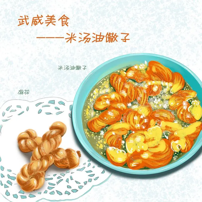 这是武威特色美食之一。金黄酥脆的油馓子,搭配浓郁的米汤,口感丰富,甜香四溢。油馓子的香脆与米汤的醇厚完美融合,不仅是当地居民喜爱的传统早餐,也承载着武威独特的饮食文化。