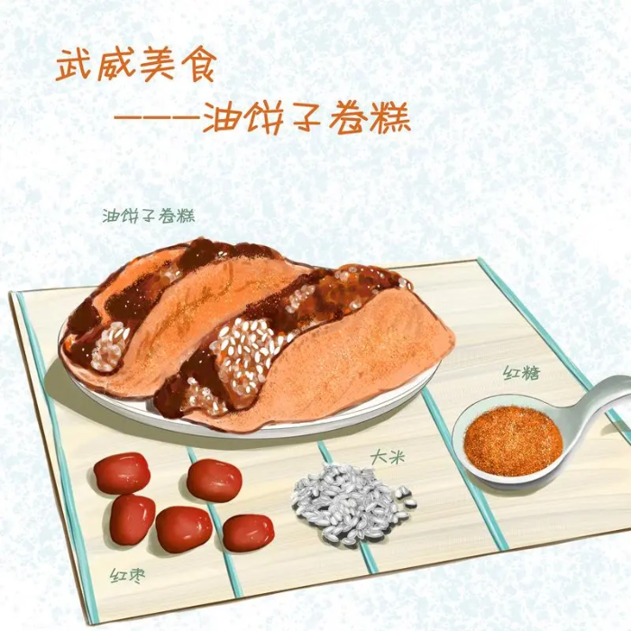 油饼子卷糕,油饼酥脆,卷着由大米、红枣等蒸制的甜糕,再淋上红糖,香甜软糯,层次丰富。食材简单却组合出独特美味,是民勤传统且受欢迎的美食。