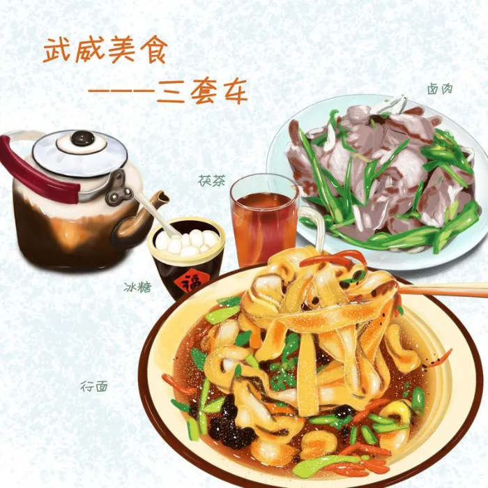 由行面、卤肉和茯茶组成。行面劲道爽滑,卤肉鲜香可口,茯茶香气醇厚,搭配冰糖,可解腻消食。是武威极具代表性的美食组合,体现了当地的饮食特色和生活节奏。