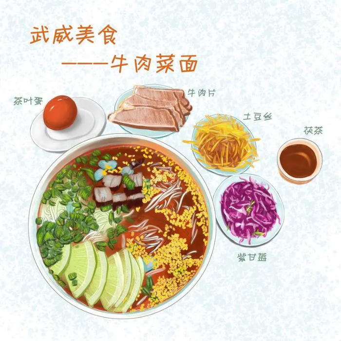 武威牛肉菜面,面条劲道,牛肉鲜香,汤汁浓郁。搭配土豆丝、紫甘蓝等清爽配菜,还有茶叶蛋和茯茶。整道美食营养丰富,色香味俱全,体现了武威人对早餐或正餐的品质追求。