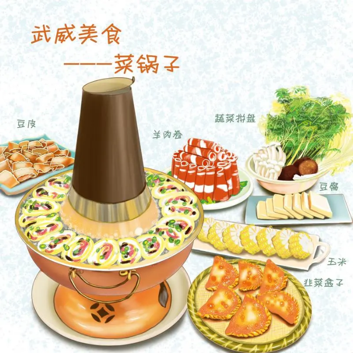 类似火锅的一种美食,有豆皮、羊肉卷、蔬菜拼盘等丰富食材。在铜锅中涮煮,大家围坐一起,边煮边吃,是武威冬日里驱寒保暖、增进情感的特色饮食,充满生活气息。