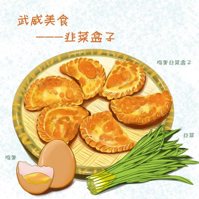 以鲜嫩韭菜和鲜香鸡蛋为馅料,包裹在酥脆的面皮中烙制而成。外皮金黄酥脆,内馅软糯鲜香,是武威的家常美味,体现了当地百姓就地取材,制作出美味又饱腹食物的智慧。