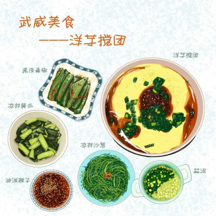 武威传统美食洋芋搅团,以土豆为主料,经反复捶打制成。口感软糯有嚼劲,搭配虎皮青椒、凉拌黄瓜、凉拌沙葱等清爽小菜,再加上油泼辣子和蒜泥,酸辣开胃,尽显地方风味。