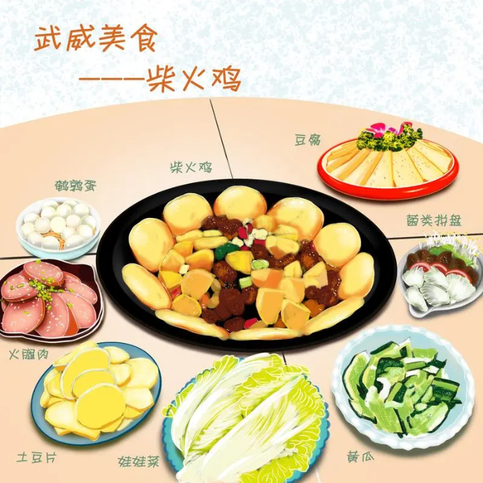 这道菜以鸡肉为主料,搭配多种食材如土豆片、豆腐、菌类等。用柴火慢炖,鸡肉入味,汤汁浓郁,各种配菜吸收了鸡肉的香味,是武威聚餐时常见的佳肴,充满浓郁的乡土气息。