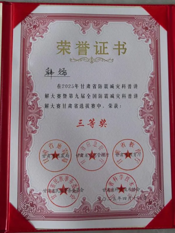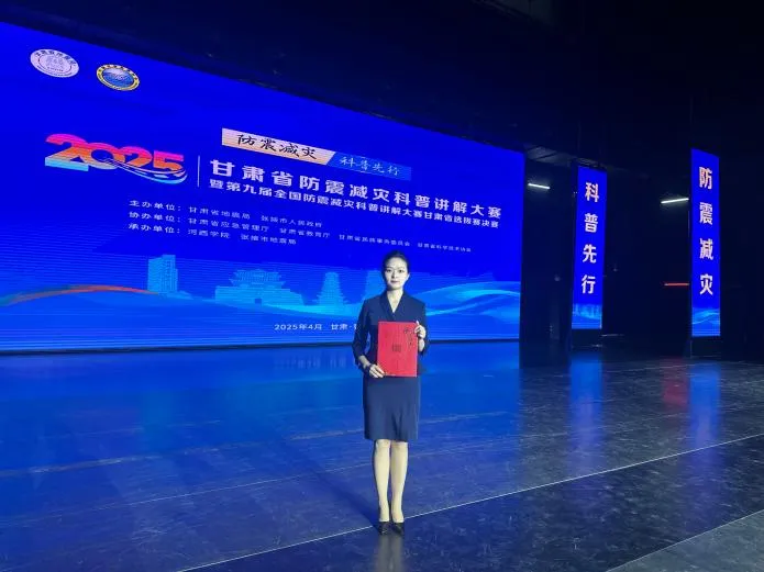 2025年4月11日,由甘肃省地震局和张掖市人民政府主办的全省防震减灾科普讲解大赛圆满结束,我馆讲解员韩嫣以《文物守护者的防震“三十六计”》为题参赛,凭借过硬的专业技能和出色的现场表现,荣获大赛三等奖。