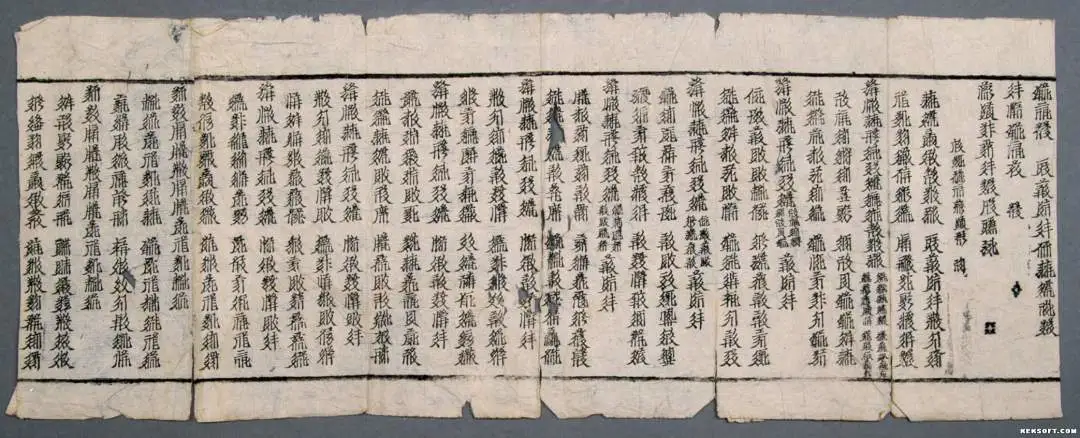 今天为大家分享的是西夏文印本经“净国生供佛礼富赞经”,甘肃武威新华乡亥母洞出土。土黄色夹丝绵纸,残存7页,单页共6行,满行最多32字,字大小两种,大字一行,下列两行小字。文字多以七言形式排列,楷书,内容为佛经,首页译为“净国生供佛礼富赞经”。木刻版印制,上下有墨线单栏,册页装。为国家二级文物,现馆藏于武威市博物馆。