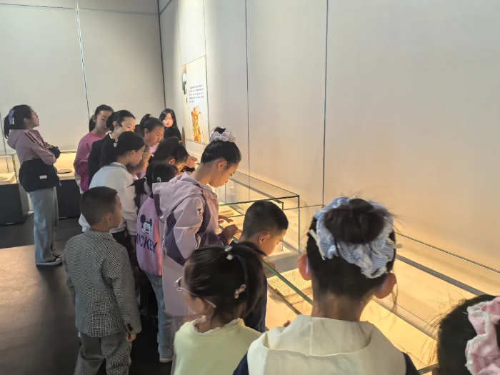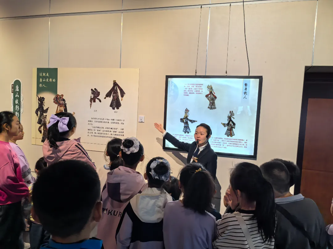 活动伊始,孩子们在讲解员的带领下,有序参观了《唐山皮影展》。展厅内,180 余件皮影珍品,以其繁复精巧的纹样和生动鲜活的角色形象,深深吸引着孩子们的目光。