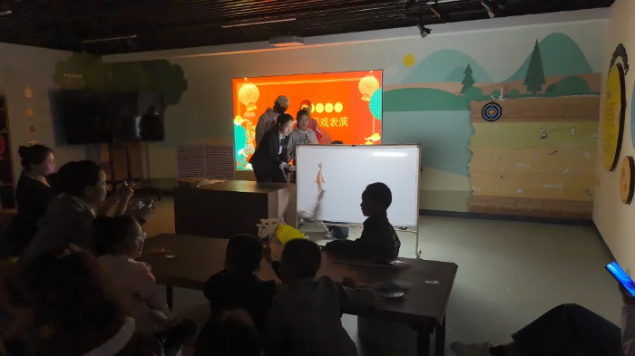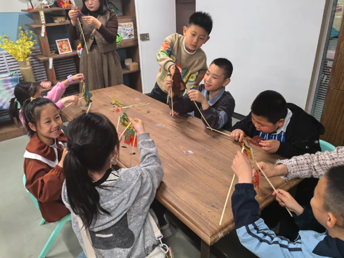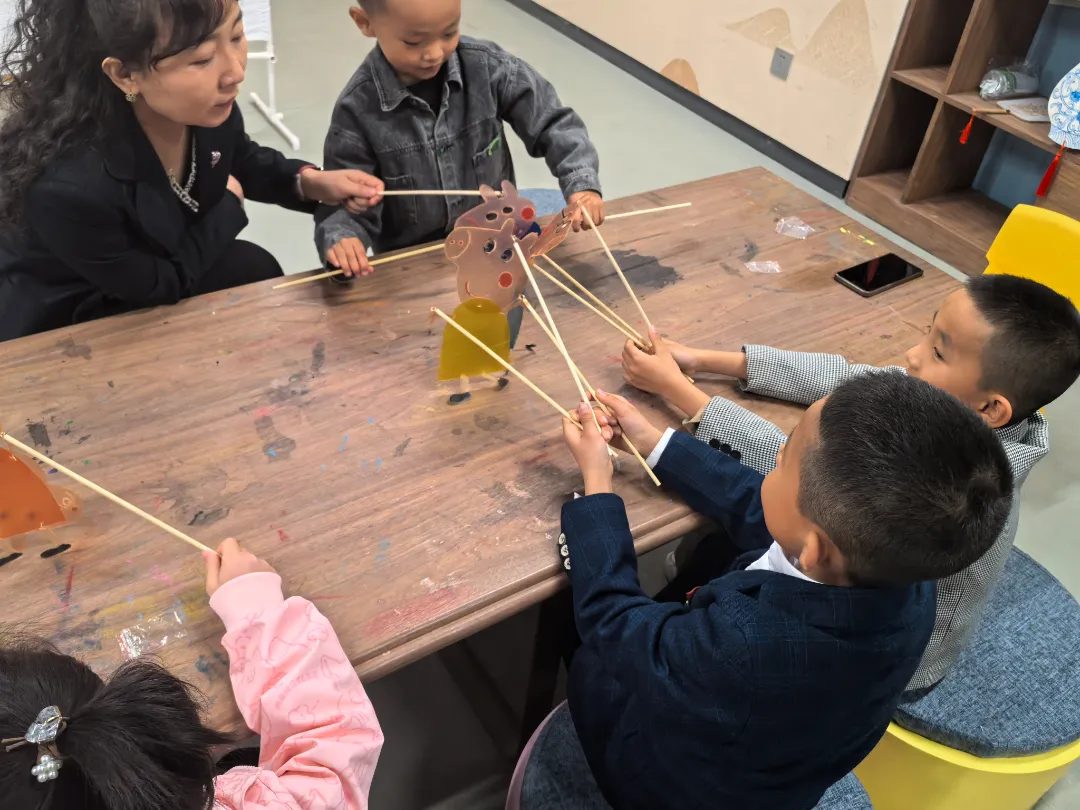 最让孩子们兴奋的当属互动演出环节,孩子们分组操控自己制作的皮影,在幕布后进行简单的表演。他们相互协作,配合默契,稚嫩的声音为皮影角色赋予生命,演绎出一场充满童趣的皮影戏,现场欢声笑语不断。通过这一环节,孩子们不仅提升了沟通能力与团队合作精神,更在亲身体验中加深了对皮影艺术的理解与热爱。