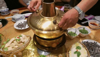 油炸丸子、发菜卷子、牛、羊、猪肉片子、豆腐块子装在锅子上面,下面垫上白菜、粉条、冬瓜、油炸洋芋、海带、木耳等蔬菜,浇上兑好的肉汤,燃起锅子中的木炭,不久就会发出“咕嘟咕嘟”的煮沸声,热气腾腾之下你尽可放慢节奏,品尝锅中美味。