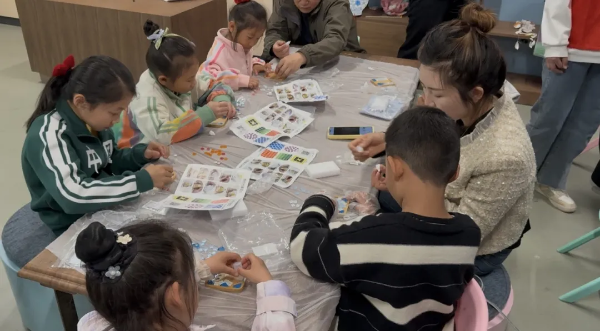 在手工DIY环节,孩子们以彩色马赛克贴片为“画笔”,在杯垫基底上自由创作,孩子们充分发挥想象力——有的拼贴出太阳、花朵等自然元素,有的设计几何图案,用色彩与构图表达对劳动的礼赞。社教老师全程指导,从贴片剪裁到粘贴技巧悉心讲解,助力孩子们完成独一无二的手工作品,在实践中提升动手能力与创新思维。