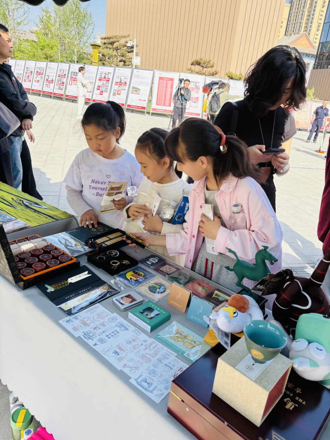 走进展区仿若走进一方浓缩的历史文化天地,独特的设计风格与琳琅满目的文创产品,瞬间吸引了众多参观者的目光。展区内,最引人注目的当属萌趣十足的“武博动物园”系列文创。以汉代彩绘木马和汉代绿釉陶立马为原型打造的“小武”和“小威”玩偶,宛如从历史画卷中跃出的精灵。它们身形圆润可爱,毛茸茸的质感让人忍不住想要触碰;圆溜溜的大眼睛透着机灵劲儿,将古代骏马的矫健神韵与现代萌趣风格完美融合。无论是孩童爱不释手的把玩,还是年轻人争相拍照分享,都让这两个萌物成为展区当之无愧的“人气王”。除了动物园系列,武威市博物馆带来的其他文创好物同样令人眼前一亮。以馆藏文物彩绘漆木鸠为原型制作的胸针,线条流畅,造型栩栩如生,为穿搭增添了一抹独特的文化韵味,仿佛将千年的灵动与优雅定格在方寸之间;而以“八鸟朝阳彩绘画像砖”为设计灵感的八鸟朝阳帆布包,不仅容量可观,满足日常出行需求,还采用高清印刷工艺,将画像砖上的图案清晰、生动地呈现出来,背着它行走街头,就如同背着一部流动的历史,让武威的文化随着步伐四处传播。
