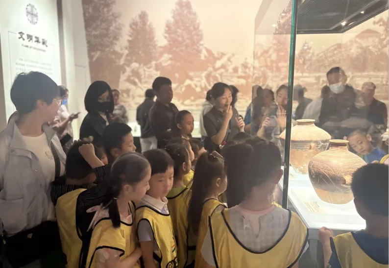 孩子们在讲解员的带领下走进展厅,通过一件件古朴神秘的彩陶器物,深入了解了马家窑文化的历史渊源、制陶工艺及纹饰寓意。漩涡纹、垂帐纹、网格纹……陶罐上流畅的线条与鲜活的图案让孩子们惊叹不已。“这些图案像在讲故事!”一名小朋友兴奋地说道。讲解员以互动问答的形式,引导孩子们观察史前先民对自然与生命的艺术表达,为后续创作埋下灵感种子。