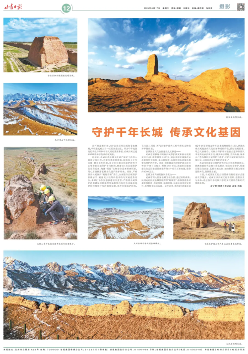 武威市深入挖掘长城文化价值,通过田野调查、民间走访形成长城资源库和“路线图”,收集整理各时期军事防御、历史事件、地理环境、民族文化等历史资料,多维解读文化内涵。去年以来,推出《令居塞在武威》等26篇研究文章和21条视频宣传片,深入研读武威长城蕴含的文化内涵和时代价值,讲好长城故事,助力文旅融合。天祝县保护站站长温占莲带领团队常年奔走在长城沿线,落实保护措施、宣传法规,她表示:“作为基层长城保护工作者,守护长城就是守护民族记忆,这是时代赋予我们的使命。”