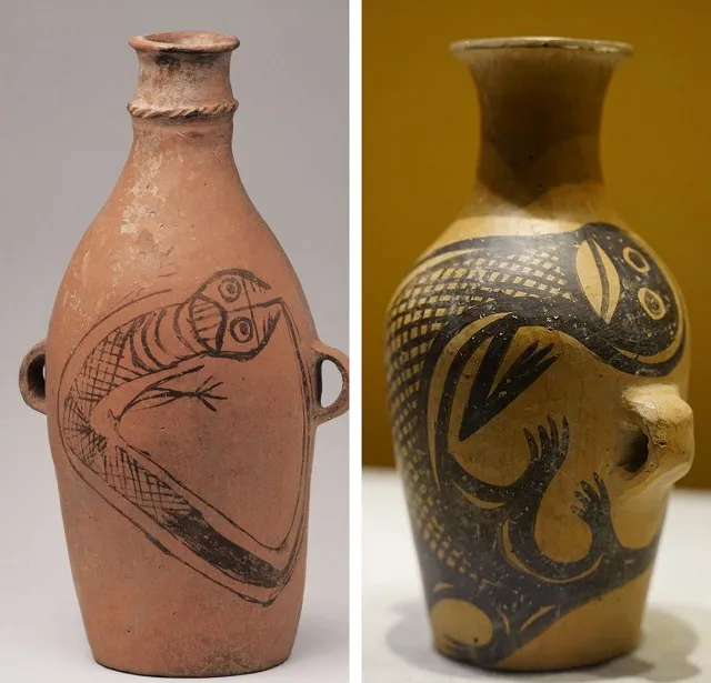 △两件仰韶文化石岭下类型的鲵鱼纹彩陶瓶,右侧这件出土于甘肃武山县马力镇付家门村种谷台遗址。