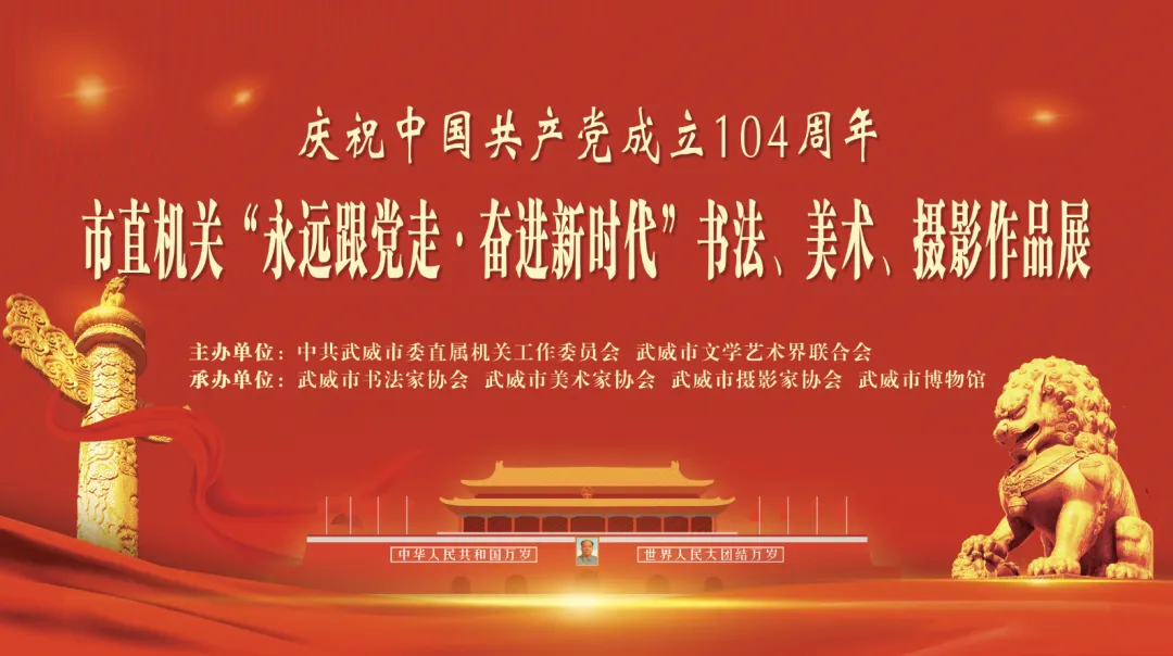 为庆祝中国共产党成立104周年,以艺术形式展现伟大祖国和全省、全市经济社会发展的新面貌、新变化、新成效,教育引导机关党员干部不忘初心、牢记使命,改革创新、担当作为,由中共武威市委直属机关工作委员会、武威市文学艺术界联合会主办,武威市书法家协会、武威市美术家协会、武威市摄影家协会、武威市博物馆承办的庆祝中国共产党成立104周年市直机关“永远跟党走·奋进新时代”书法、美术、摄影作品展于今日在武威市博物馆开展。