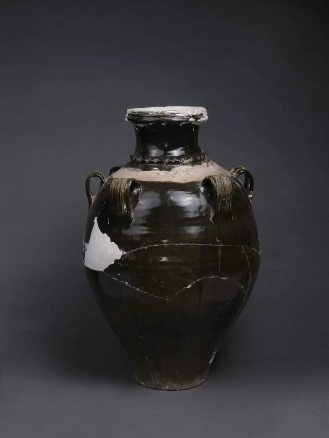 大家好,今天为大家分享的是六系黑釉瓷罐,西夏瓷器,侈口,重唇,束颈,溜肩,肩部六系,深圆腹,腹下部内收,圈足,白胎黑釉,肩部刮釉。肩颈有堆塑纹一圈,腹部有弦纹数道。造型丰满,色泽光亮。为国家三级文物,现藏于武威市博物馆。