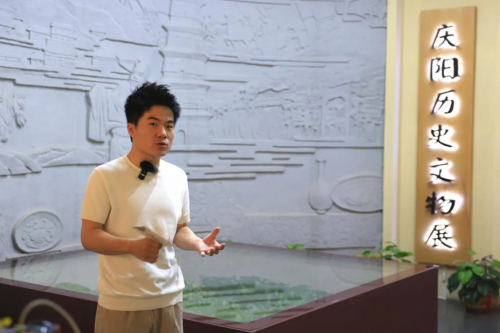 在历史文物展厅入口,竖着一幅厚灰的石壁,庆阳市地理区位的沙盘横置壁前,棕黄色与翠绿色层层叠叠、深浅不一,宛若大地的年轮,无声诉说着百万年的风霜雪雨。