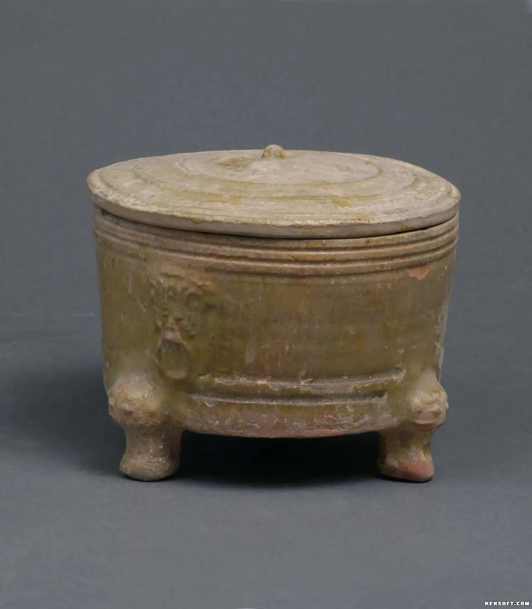 大家好,今天向大家分享的是汉代陶器黄釉陶奁。红陶质,黄釉。由盖、身两部分组成。圆盖,半圆形钮,钮座为四菱形花瓣,器身为圆口、直腹、平底,颈腹两圈弦纹,腹外壁贴塑一对铺首。四兽形足。为国家三级文物,现馆藏于武威市博物馆。