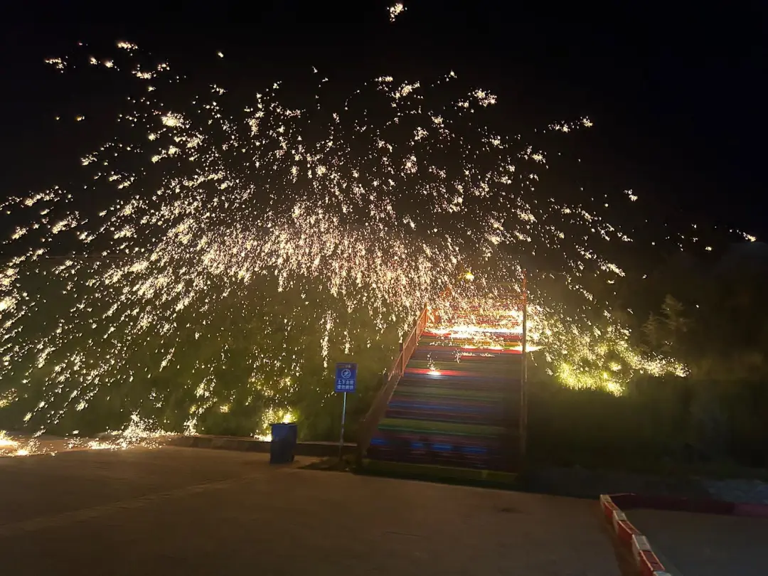 非遗打铁花表演紧随其后,再次点燃观众的热情。夜幕中,匠人们手持特制工具,将千余度的铁水奋力击打向夜空,瞬间化作万点金星,如流星坠落、似烟花绽放,金色花雨在黑夜里划出璀璨弧线;一旁的火壶表演同样精彩,表演者手持燃着火焰的壶具,在灵巧的腾挪翻转中,让火焰随动作舒展、盘旋,时而如火龙腾空,时而似火雨纷飞,两种非遗技艺交相辉映,引得观众阵阵欢呼,手机镜头纷纷对准这震撼的瞬间。