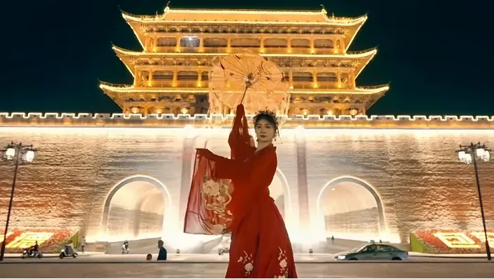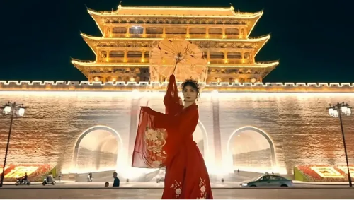 河西都会夜晚灯火辉煌,楼阙场馆灯光璀璨,仿佛重回汉唐盛世,身着汉服漫步其中,如同穿越到剧中的繁华都城。