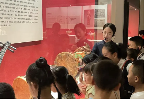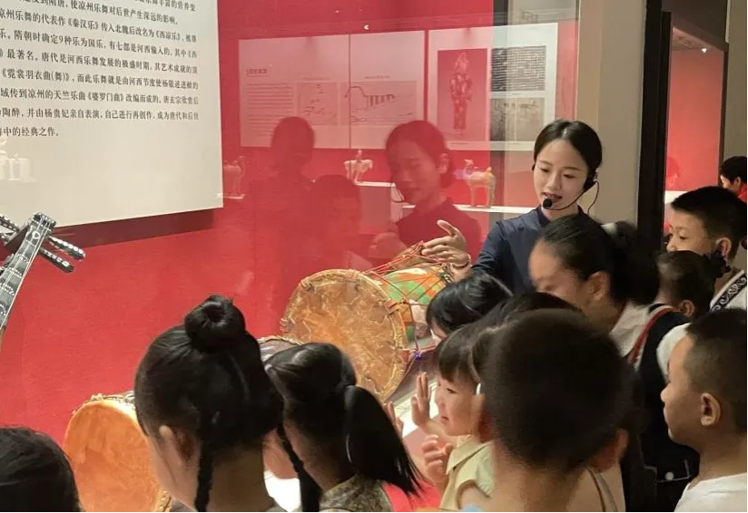 活动伊始,通过社教老师的精彩讲解,孩子们穿越历史长河,了解西凉乐舞的发展脉络。西凉乐舞起源于古凉州,是丝绸之路文化交流的结晶,融合了中原雅乐、西域音乐和印度音乐,自唐以来便盛行不衰,对中国古代乐舞发展产生了深远影响。而展柜里的西凉乐器成为直观窗口,孩子们在欣赏与了解中触摸西凉乐舞文化历史变迁的轨迹。