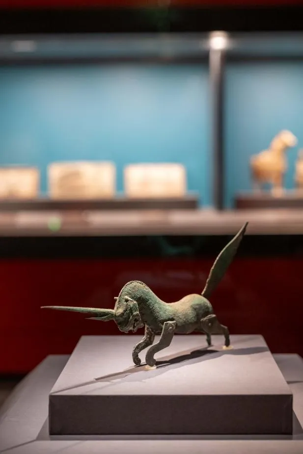 为全面展现凉州的历史脉络与文化魅力,本次展览精心甄选了来自武威、张掖、酒泉3个地市共6家博物馆的181套272件珍贵文物(其中,我馆参展展品120套),分六个单元娓娓道来。“文明星火的传递:早期东西交流”单元,通过马家窑文化圆点纹折腹彩陶罐、四坝文化菱格纹双耳双鋬彩陶罐等文物,让观众从彩陶和青铜中领略早期东西文化交流的印记;“河西四郡:凉州的‘第一块拼图’”单元,以新莽大泉五十铜钱范、汉代王杖诏书令册简、彩绘漆木鸠等,勾勒出西汉时期凉州纳入中原版图后,在政治、文化、社会等方面的发展图景;“五百年间延绵一脉”单元,借助魏晋莲花藻井砖、北凉千佛壁画、魏晋彩绘采帛木几图壁画砖等,呈现魏晋南北朝五凉时期,凉州作为中西文化交流汇合点的繁荣景象;“凉州七里十万家”单元,通过唐胡人牵驼图模印砖、翟舍集墓志、镀金口三鱼莲瓣纹银碗等,再现隋唐时期凉州胡汉杂居、商旅往来的盛世繁华;“瀚海明珠:西夏辅郡”单元,以西夏善业泥佛像、西夏文手抄文书等,展现西夏时期凉州的佛教文化与独特文字魅力;“西风漫卷:诗思入凉州”单元,通过元代藏文“六字真言”石经版、清代乾隆款珐琅驯马图薄胎瓶等,呈现元明清时期凉州文化的延续与发展。