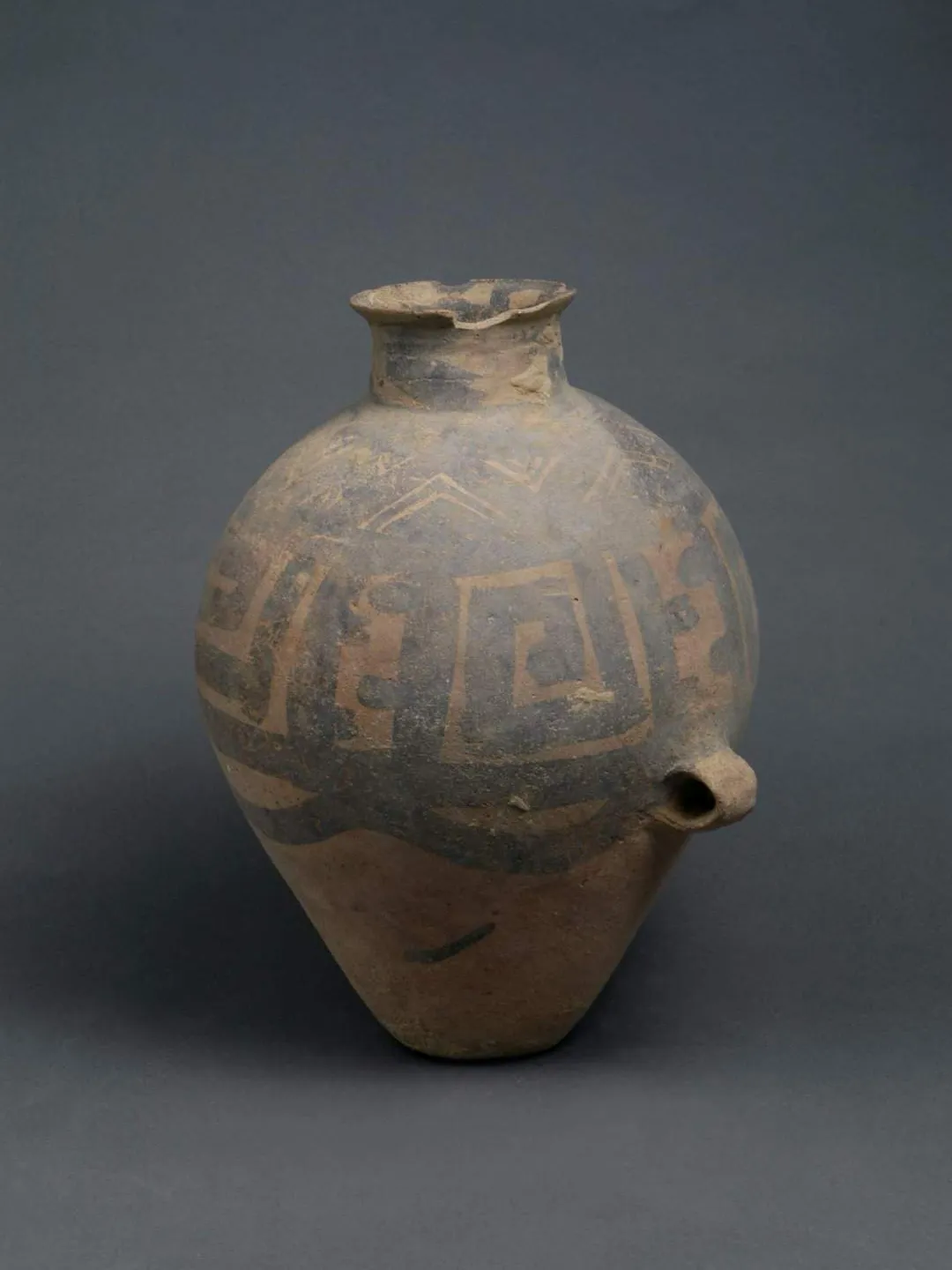 今天向大家分享的是马家窑系回纹双耳彩陶壶。新石器时代陶器。泥质红陶。侈口,短颈,溜肩,深弧腹,下腹渐收,平底。腹两侧双圆耳。通体涂红衣。墨绘纹饰,腹部主题纹饰为回纹和连弧纹。肩部辅饰三角形纹。为国家三级文物。现藏于武威市博物馆。