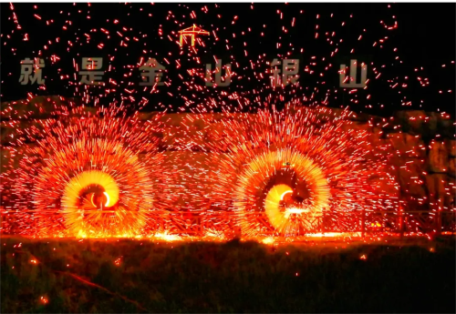 夜幕降临,文旅活动依然精彩。非遗打铁花表演,匠人们将千余度的铁水击向夜空,瞬间化作万点金星,如烟花般绚烂绽放;融合民俗的篝火晚会,游客们手拉手围着火焰起舞,欢声笑语回荡在夜空;火壶表演中,表演者手中舞动的火焰如灵动游龙,让现场气氛高潮迭起;音乐主题活动更添亮色,经典红歌演唱、器乐演奏、舞蹈表演及戏曲选段等节目轮番上演,让现场观众沉浸在红色文化的独特魅力之中。