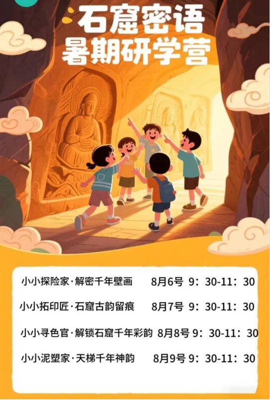 当千年前的凿刀在岩壁上落下第一笔,石窟便成了时光的密码箱——佛像的衣纹藏着朝代的风,壁画的色彩记着丝路的光,洞窟当中藏着古人与天地对话的秘密。同学们,你是否好奇古老的石窟中藏着怎样的故事?想亲手触摸历史的纹路,解开壁画与雕塑的神秘符号吗?武威市博物馆“石窟密语”研学营即将启程!在这个暑假将带你开启穿越时空的冒险!叮~你的“石窟密语”暑假研学营课程表,请查收~