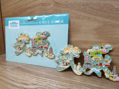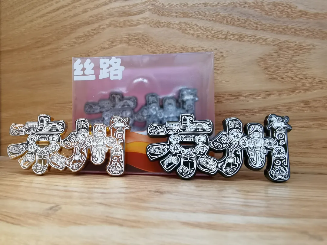 “武威”冰箱贴,以“武威”二字为轮廓,质地精致,金属光泽勾勒古韵。浅绿釉为底,搭配金、白等色,天梯山石窟的佛像、鸠摩罗什寺的塔,还有灵动的马踏飞燕元素,像把丝路故事全“贴”在上面,细节里都是历史温度。