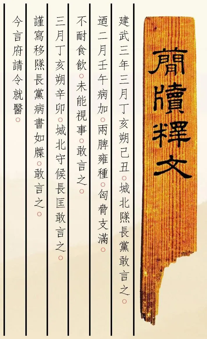 01 汉代边塞的病假条 流程清晰可见 1974年,在甘肃居延 甲渠候官遗址第22号房址内 考古人员发掘出三枚相连的木牍 由此揭开了一段汉代边塞的往事: 建武三年(公元27年)初春,二月壬午日 城北燧长“党”突感不适 他自诉“两脾雍种,匈胁支满” (双腿浮肿,胸部胀痛) 强撑病体工作一周后 他觉得自己实在撑不住了 于是在三月己丑日提笔写下病假书 向上级候长“匡” 坦言自己“未能视事”(无法履职) 候长“匡”收到文书后不敢怠慢 于两天后的三月辛卯日 立刻将情况转呈给更高级别的候官 并附上“党”的原始陈述 文书末端,一行批示清晰有力: “今言府请令就医” (即刻上报都尉府,准其就医) 三枚木牍环环相扣 一份“病假条”的审批链条 清晰可见,严谨周密 堪称汉代行政运作的“活化石” 02 从三枚木牍 解码汉代边防“硬核”管理 为何汉代戍边吏卒请个病假 流程如此严格? 这要从汉代的烽燧制度说起 为了防御匈奴 汉朝沿长城构建了精密的“候望系统” 其中,“燧”(一座烽火台)是最小的警戒单元 由“燧长”统领 别看燧长官职不高、手下戍卒不过几人 却肩负着瞭望敌情、燃烽传讯的重任 一旦燧长病倒,信号无法发出 整条防线可能就面临“失守” △建武三年隧长病书(释文) 因此,汉代边塞设立了 严格的病假呈报制度 在边塞生病请假会影响劳绩,在计算吏员工作业绩时会被记录下来,作为个人考课的重要依据。 这份建武三年的病假条 正是这一制度最生动的写照 小小木牍里 藏着汉代边防高效运转的“密码” 03跃然“牍”上的汉隶之美 这三枚木牍 不仅记录了请假流程 更是汉代书法的绝佳范例 △建武三年隧长病书(局部) 燧长“党”自述病情 以及候长“匡”撰写的转呈文书 用的都是工整标准的官方字体:汉隶 横平竖直,方方正正 一笔一画都透着官方文书的庄重感 △建武三年隧长病书(局部) 再看末尾那行候官的批示 “今言府请令就医” 相较于前文的规整 这几字明显更为率意奔放 笔画间连带自然 仿佛书写者带着 “这事我批了,赶紧办”的果断洒脱 △建武三年隧长病书(局部) 一牍之上,两种字体,风格迥异 时隔2000年 我们不仅能读到简牍上内容 更能从这或工整或潇洒的笔迹里 真切感受到书写者彼时的心情与状态 这正是简牍书法的独特魅力 三枚木牍裹挟着边塞的风沙 将汉代严密的制度、戍边生活的气息 连同书写者的情感 都凝练在这方寸墨痕之间 它们不再是历史冰冷的物证 而是2000年前的人间烟火 来源:央视新闻