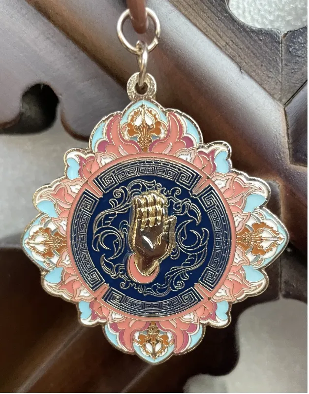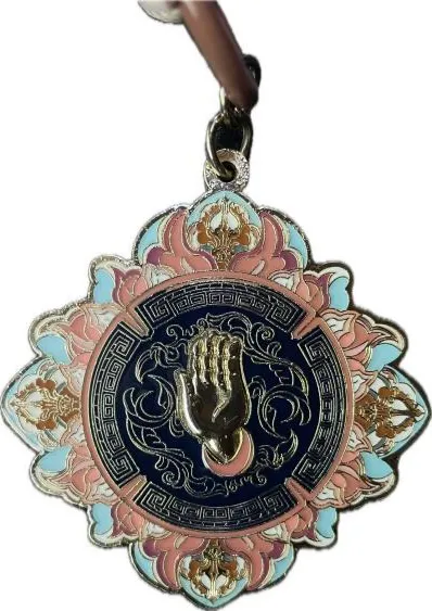 花瓣造型边框,像从天梯山石窟壁画里摘下来的 !珐琅彩描出粉蓝渐变,温柔又梦幻,中间佛手鎏金质感拉满,周围花纹细腻非凡,仿佛能看见工匠拿着放大镜“精雕细琢” 。摸起来光滑锃亮,细节控狂喜——每一道纹路、每一抹色彩,都在诉说它的精美。