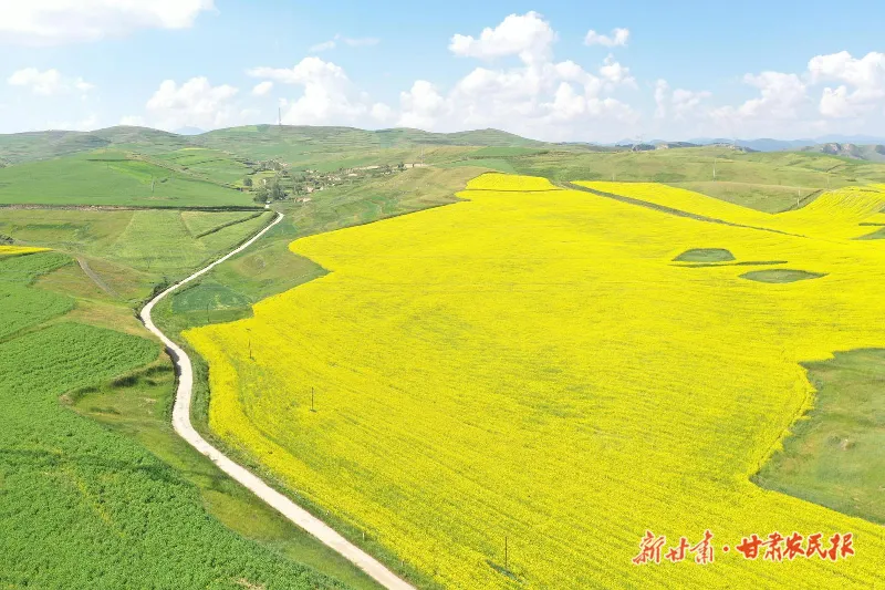 眼下,在武威市古浪县黄羊川镇大南冲村的田野上,千亩油菜花如金色海浪般铺展。站在高处远眺,金黄色的花海绵延不绝,与蓝天白云、蜿蜒道路构成一幅绚丽的田园画卷。