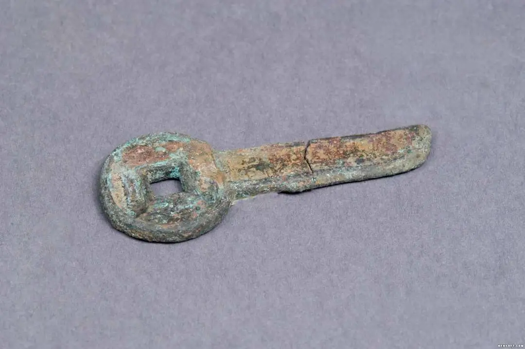 今天向大家分享的是“一刀平五千”铜币。王莽居摄二年货币。铜质,钥匙形。圆形方孔身,匕形柄。圆形钱面上“一刀”二字错金,匕形柄上“平五千”三字,钱文隶书。为国家三级文物。现藏于武威市博物馆。