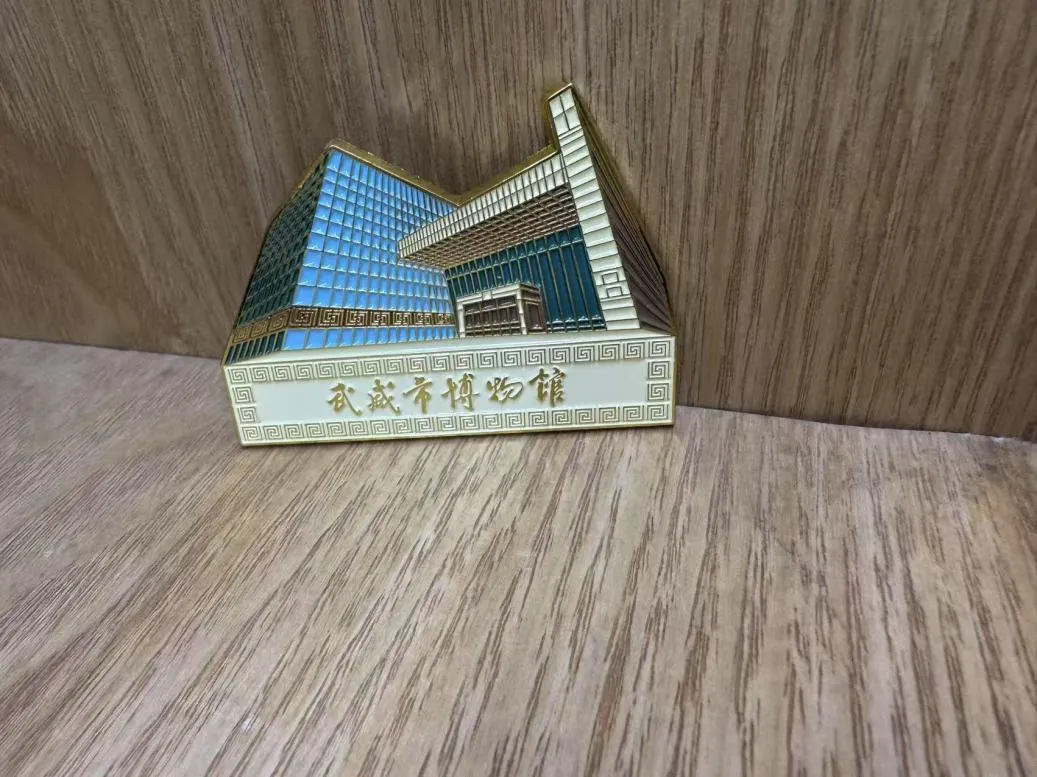冰箱贴完美复刻了武威市博物馆的建筑外观:几何感十足的造型、珐琅工艺还原出的通透蓝绿色“玻璃幕墙”、金色线条勾勒的精致结构,连建筑底部的回纹装饰都清晰可见,“武威市博物馆”的字样古朴又醒目。往冰箱上一贴,瞬间成为家居里的“文化焦点”!